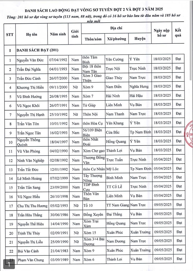 DANH SÁCH LAO ĐỘNG ĐẠT VÒNG SƠ TUYỂN CHƯƠNG TRÌNH THỜI VỤ ĐỢT 2 VÀ 3 NĂM 2025