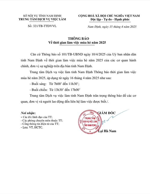 Trung tâm Dịch vụ việc làm tỉnh Nam Định gửi tới DN và người lao động lịch làm việc mùa hè 2025